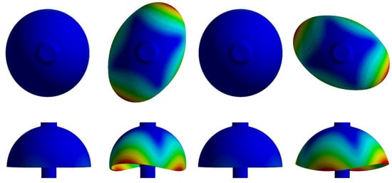 By designing the detailed structure of the hemispherical resonator to separate the modal of the spherical shell and the rob of the resonator, the ideal resonator only operates in the four-antinode vibration mode of a hemispherical shell, as shown in Figure 2. Different colors within the model of the resonator represent different magnitude of the stress, which can also equivalent to the magnitude of the deformation, and the red part represents the maximum stress.