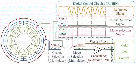 A single-channel control scheme of an RI-HRG is a widely adopted control scheme. It utilizes several multiplexers to realize time-division multiplexing within a single detection and driving chain, sequentially fulfilling the signal detection and driving in Channel and Channel according to a specific time sequence [29]. Consequently, the single-channel scheme effectively mitigates unbalanced errors in the detection and driving chains between Channel and Channel caused by circuit disparities. Moreover, it enhances the utilization rate of each electrode during the detection and driving process, which can also partly suppress the impact of manufacturing defects within the hemispherical resonator. However, the use of multiplexers necessitates consideration of signal settling times in the digital control circuit, which constrains the frequency of the control system and causes additional signal delay errors, leading to non-ideal standing wave drift. Additionally, the use of multiplexers adversely affects the circuit’s overall stability and signal-to-noise ratio. A schematic diagram of a single-channel control scheme is displayed in Figure 3.