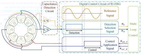 The dual-channel control scheme is developed from the control system of three-piece HRGs. Each electrode serves a specific function and is free from additional functions, so that Channel and Channel can active simultaneously [30,31,32]. The dual-channel control of RI-HRG is shown in Figure 4.