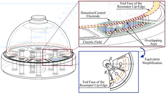 The detection and driving processes of RI-HRG are based on the equivalent flat capacitor, which is formed between the end face of the resonator lip-edge and the flat electrode, as shown in Figure 5. In Figure 5, represents the inner spherical radius of the resonator, represents the outer spherical radius, denotes the electrode span angle, and indicates the electrode center angle.