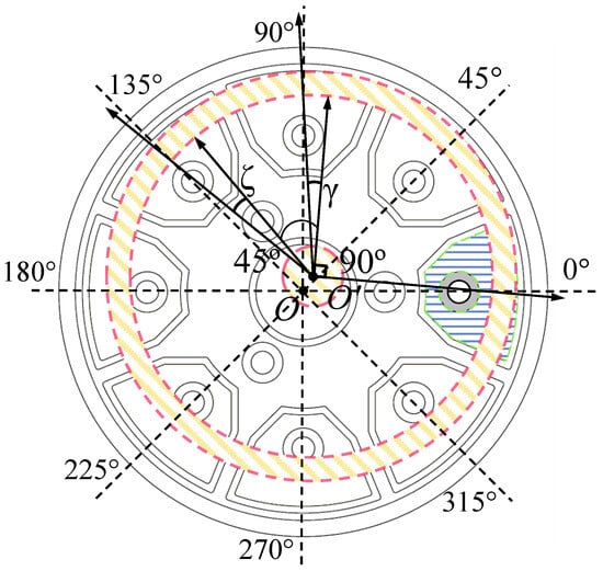 With the impact of the assembly eccentricity error, the center angles of the electrodes used in the driving chain shift from and to and , respectively. In fact, the diameter of the assembly hole in the center of the flat electrode is only marginally larger than that of the support rod of the hemispherical resonator, so that an adequate space is kept to fill with adhesive while assembling. Although it may cause assembly eccentricity error, the resultant electrode deviation angle is a small quantity. Therefore, the deviation angle between different channels can be approximately considered consistent. If the electrode deviation angle caused by the assembly eccentricity error is , then the control forces will change to the following form under the influence of the assembly eccentricity error:
