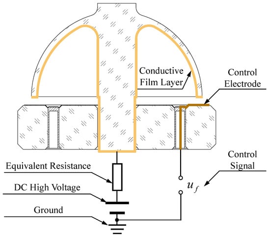 The equivalent resistance shown in Figure 8 represents the resistance between the end face of the resonator lip-edge and the end face of the support rod. Each point corresponds to a unique equivalent resistance, resulting in varying DC high voltages along the end face of the resonator lip-edge projected to the driving electrodes in Channel and Channel . Ideally, ignoring the equivalent resistance, if the input DC high voltage at the support rod is , then the DC high voltage at the end face of the resonator lip-edge is also . However, due to the imperfect manufacturing of the film layer, the actual high voltage at the end face of the resonator lip-edge corresponding to the driving electrodes in Channel and Channel will be reduced to and , respectively. Under this circumstance, the control force can be expressed as follows: