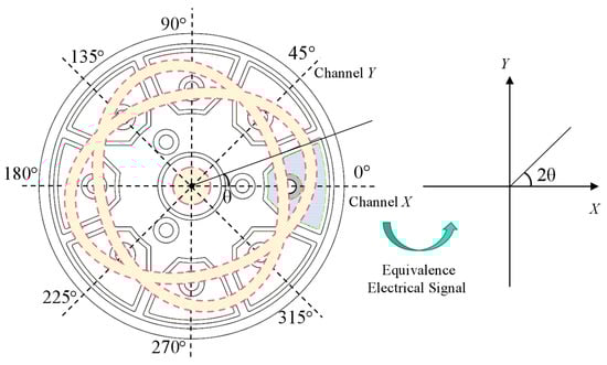 where, , is the reference gain of the control forces relative to the control outputs and is the unbalanced gain error. With the impact of the assembly eccentricity error and the coupling error, the control forces applied to the driving electrodes in Channel and Channel are no longer orthogonal in position, which is equivalent to introducing an angle error, so that the coupling coefficient is replaced by , which has the same range of values and is consistent with the form of the assembly eccentricity error and much easier to explain. On this basis, is further defined as the equivalent misalignment angle and is defined as the unbalanced equivalent misalignment angle error. Further, the Equation (20) can be rewritten as follows: