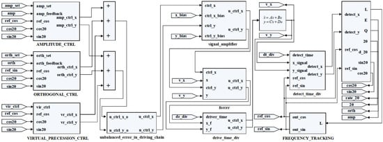 A numerical simulation platform was built with consideration of the multi-loop control scheme and key characteristics of the RI-HRG to better verify the correctness of the model of the unbalanced error in the driving chain and the effectiveness of the error identification and compensation method by comparing the error identification results with the preset errors through the numerical simulation. The numerical simulation platform is shown in Figure 11.