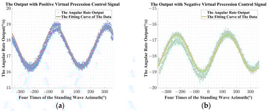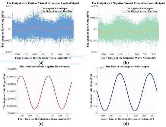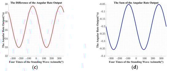 As shown in Equation (32), the impact of the unbalanced error in the driving chain on the angular rate output is related to the four times standing wave azimuth. Therefore, in subsequent simulations and experiments, the main focus is on the relationship between the angular rate output and the four times standing wave azimuth. On this basis, with the consideration of the unbalanced error in the driving chain, the simulation results obtained with a couple of virtual precession control signals that are opposite to each other were applied are shown in Figure 12.