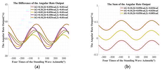 The simulation results with different unbalanced error in driving chain: (a) the difference of the angular rate output with different unbalanced gain error and the equivalent misalignment angle; (b) the sum of the angular rate output with different unbalanced equivalent misalignment angle error.