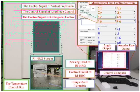 The RI-HRG system used in the experiment mainly consists of two parts, namely the sensing head and the control circuit. According to the previous performance testing of the sensing head, the quality factor of the sensing head used in the experiment was about 7.91 × 106, and the frequency split was about 3.1 MHz During the experiment, the external angular rate input was not required; however, a single-axis turntable was used to keep the sensitive axis of the sensing head to the east, so that the influence of the Earth rotation rate was eliminated, and a temperature control box was used to isolate the influence of the temperature. Besides, according to the experimental process, measurement and control software was used to modify the virtual precession control signal and record the relevant data. Furthermore, a temperature control box was also used to isolate the impact of the changes in the external environment. The experimental system and the measurement and control software are shown in Figure 14.