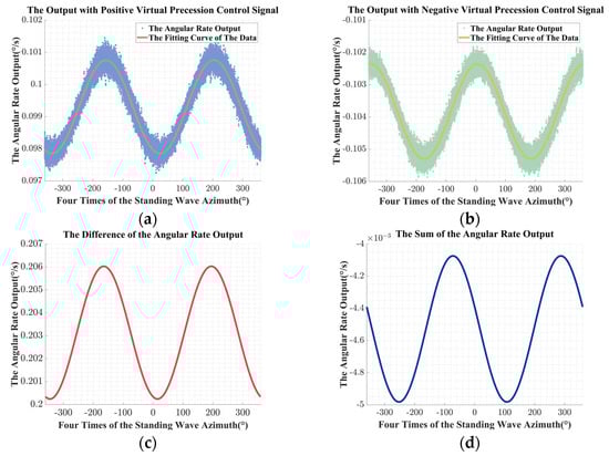 The experimental results after compensation: (a) the angular rate output with the positive virtual precession control signal; (b) the angular rate output with the negative virtual precession control signal; (c) the difference of the angular rate output; (d) the sum of the angular rate output.