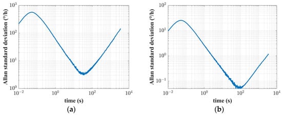 Furthermore, as zero-bias instability is an essential indicator of the performance of RI-HRG, so that the zero-bias instability test is conducted before and after the compensation of the unbalanced error in the driving chain, and the lowest point of the Allan standard deviation curve can represent the zero-bias instability of the RI-HRG, the Allan standard deviation curves are shown in Figure 17.