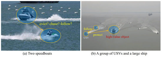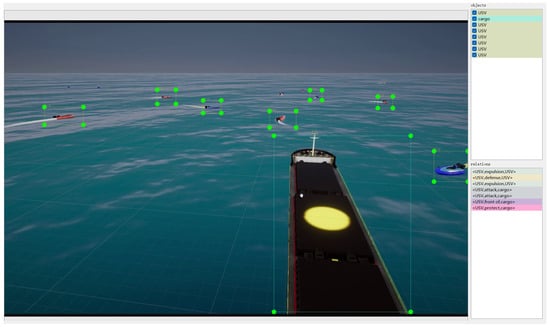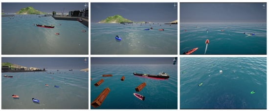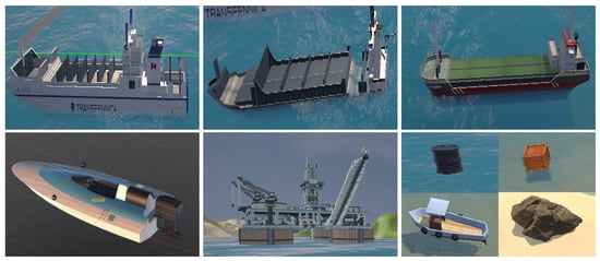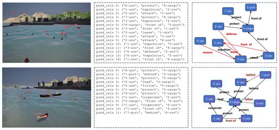 In the construction of scenes, this study refers to commonly observed navigation scenes and primarily divides them into port, island, and open sea, as shown in Figure 3. Regarding the selection of target entities, in addition to common cargo ships, cruise ships, and USVs, it also includes offshore drilling platforms (ODPs) and other obstacles, as illustrated in Figure 4. In terms of entity relationship selection, apart from intuitive relationships such as “follow” and “beside”, we have also identified more complex implicit relationships, such as “defense” and “rescue”, which require contextual understanding through simulation. The specific entity and relationship annotations are presented in Figure 5. The object labels we annotated include categories and bounding boxes, while relationships are stored in the form of triplets, such as <USV, defense, cargo>. Based on simulations and collected actual samples, we eventually selected and annotated a total of 2240 image data samples, encompassing 20 types of entity relationships.