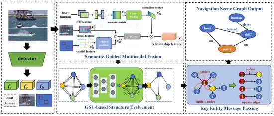 As shown in Figure 1a, the visual relationships between the front and rear speedboats can be described by various predicates, such as chase, follow, or evict. The ambiguity of visual relationship semantics makes it difficult to extract specific semantic features. However, in Figure 1b, if the detected intermediate object in the current scene is a high-value object (entity), such as a cargo ship, the contextual information can be used to determine the relationship between the unmanned surface vessels (USVs) and the cargo ship as a protecting relationship, while the relationship between the USVs is likely to be a following relationship. This indicates that relationship inference in the process of generating navigation scene graphs heavily relies on contextual information. Therefore, it is crucial to eliminate noise interference, such as non-key nodes, and identify key objects. To address the diversity of relationships between objects in navigation scenes and the impact of noise interference in contextual information on relationship feature extraction, this paper proposes an NSGG method based on semantic-guided multimodal fusion and key entity message passing, named SGK-Net. The aim of this method is to improve the quality of relationship feature extraction and achieve efficient and high-quality NSGG.