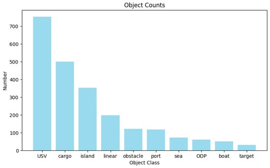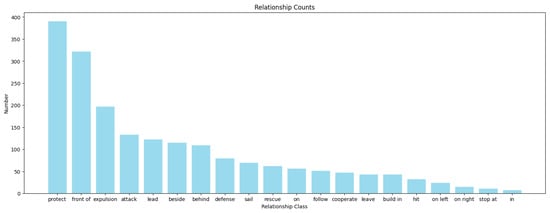 We conducted a statistical analysis of the constructed SNSG-sim dataset. Figure 6 illustrates the distribution of target entities in the dataset. It can be observed that the annotated target entities in our dataset include foreground objects such as USVs, cargo ships, and cruise ships, as well as background elements like ports and islands, commonly found in navigation scenes. Among them, USVs have a relatively higher representation. This is because, in our dataset, USVs tend to appear in groups during tasks such as protection and defense, leading to a higher frequency of occurrence within the same image sample. Figure 7 displays the distribution of relationships in the constructed dataset. As mentioned earlier, our dataset specifically annotates 20 types of relationships between target entities, addressing the characteristics of navigation scenes. This augmentation enhances the diversity of scene graph generation in our study and improves the understanding of various navigation scenes by using ship models. Furthermore, the statistical graph reveals a similar long-tail distribution issue in both target entities and relationships within navigation scenes, as observed in public scene graph datasets [25,26]. This poses a challenge to the performance of NSGG methods.