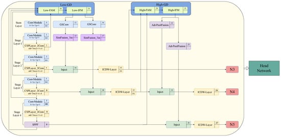In light of this, there arises a necessity to introduce the GD mechanism, which systematically gathers and amalgamates information from diverse scales through a unified module, subsequently distributing the fused features across distinct layers [19]. Within this mechanism, the feature alignment module (FAM) [59] and information fusion module (IFM) synergistically aggregate features from disparate hierarchical echelons. The inject module subsequently disburses the amalgamated information throughout diverse layers of the network. This strategic orchestration enables the model to judiciously harness multi-scale features, thus elevating object detection precision while retaining low latency. This approach not only circumvents the inherent information loss observed in traditional FPN structures but also amplifies the information fusion capacity of the neck section without a significant increase in latency. It more judiciously harnesses the features extracted by the backbone network.