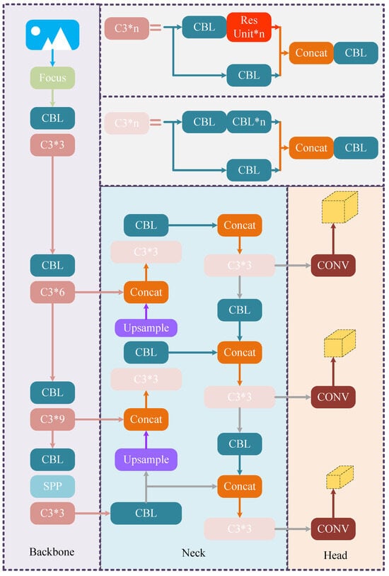 To effectively mitigate gradient fading under the premise of ensuring network depth, the ResNet structure is adopted in the algorithm framework of YOLO-V5. The backbone of the original YOLO-V5 algorithm contains four CSP Bottleneck with three convolutions, called C3, where each C3 contains one or more sets of residual units. The specific architecture of the YOLO-V5 algorithm and residual unit are shown in Figure 1 and Figure 2, respectively.