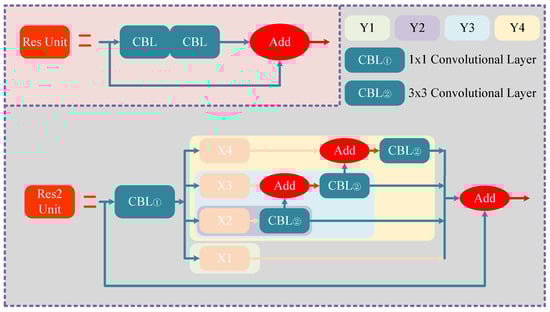 Although the C3 in the structure of YOLO-V5 can effectively increase the depth and receptive field of the network, and improve the ability of feature extraction, the residual unit in C3 reflects multi-scale features by layering, which easily leads to the underutilization of the features of each layer. Meanwhile, it is worth noting that the shortcoming of small object visualization features in remote sensing will further expand the defects of C3 in feature utilization. Based on this, a new residual unit [] is employed to acquire features to solve this problem. It constructs hierarchical residual class connections in a single residual unit to complete feature extraction, called Res2Unit. Res2Unit enables the representation of multi-scale features at a finer granularity while increasing the range of acceptable domains for each layer to a certain extent. It is not difficult to find that the purpose of increasing the perceptual domain of each layer can be achieved by introducing several small residual terms into the residual unit. The structure of Res2Unit and the basic residual unit are shown in Figure 2.