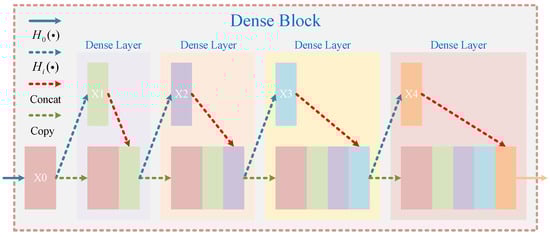 The network structure of the DenseNet block is shown in Figure 3, where means the feature map of the output, and and are the convolutional layer and the transport layer, respectively. Each layer can be connected to all other layers, which also means that each layer is able to receive all of the feature maps of the previous layer. With its unique structure, DenseNet can effectively alleviate the gradient attenuation of networks. Meanwhile, because each layer in the dense connected network will receive all of the feature mappings of the previous layer, the transmission of network features will be effectively enhanced, while the parameter volume of the network model will be also reduced to a certain extent.