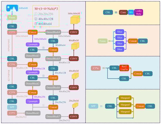 As can be found from the neck in the original YOLO-V5 structure, each detection layer contains no less than seven convolutional layers. Although these convolutional layers can fully merge the feature maps of RSSOs from different layers and enhance the ability of the feature expression, too many convolutional layers will also lead to network gradient fading. Therefore, to ensure the feature expression ability of RSSOs while avoiding the network gradient fading caused by too many convolutional layers, the concept of a densely connected network (DenseNet) is adopted in the neck of YOLO-V5. DenseNet is composed of three core structures, namely DenseLayer (the most basic atomic unit of DenseNet), DenseBlock (the basic unit of DenseNet; also the core part of DenseNet) and Transition (the main function of which is to reduce the size and number of feature maps). It should be noted that the DenseBlock module can be regarded as stacking a certain number of DenseLayers, and DenseBlock is employed in this paper. The detailed concepts of DenseNet can be obtained from [].