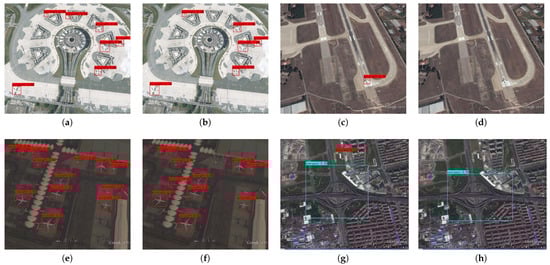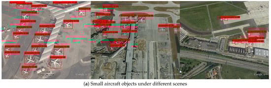 With the efforts of researchers at home and abroad, object detection (OD) has made great progress. However, small-object detection (SOD) in complex scenes, especially RSOD, is still full of challenges, especially when there are lighting, occlusion, and similar-background interferences [,]. To improve the performance of RSOD, researchers have designed a variety of improved algorithms from different perspectives and problems. In Ref. [], a new method for RSOD, which combines a feature detection module inspired by a sparse-representation-based generalized Hough transform, was proposed, and it involves the process of learning a dictionary of objects and backgrounds to continuously supplement the sparse image representation of specific classes to realize RSOD.