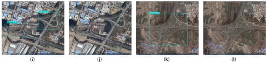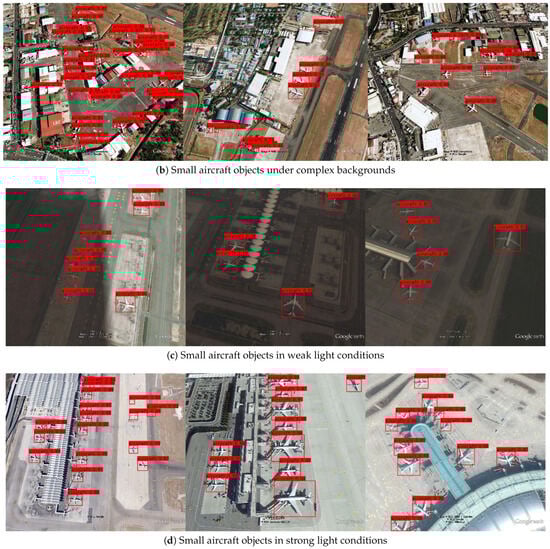 Figure 5 show some detection results of I-YOLO-V5 in different scenarios and under different conditions. From the comparison between Figure 5a and Figure 5b, it is not difficult to find that the complexity of the environment (such as the density of buildings) in RSSO detection will have a certain impact on the detection accuracy of the algorithm. Meanwhile, it can be found from Figure 5 that the detection accuracy of small- and medium-sized objects in Figure 5d is slightly better than that of small objects in Figure 5c, which further indicates that the light intensity has a certain degree of influence on the detection accuracy of small objects.