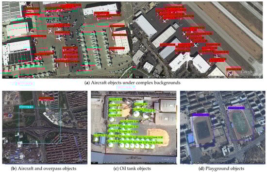 Remote sensing images (RSIs), especially high-altitude RSIs (HRSIs), are mainly generated by satellite or aircraft imaging systems. HRSIs are widely utilized in weapon guidance, emergency rescue, intelligent agriculture, and other fields, and have gradually become the focus of related studies [,,]. However, on account of remote sensing satellites always taking images at high altitudes, the quality of HRSIs is affected by many factors, possibly causing various types of geometric deformation, distortion, blurring, and noise in HRSIs. These factors include atmospheric conditions, illumination variation, and environmental interference, which make it difficult to detect an object in RSIs accurately with a complex background [,]. At present, there are still many problems and challenges waiting to be solved in the field of remote sensing object detection (RSOD), including unsatisfactory detection accuracy, detection errors, and missing rate. The existence of these problems not only limits the further application of RSIs, but also causes some problems in practical applications.