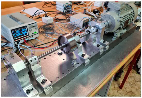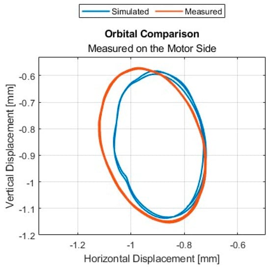 The analysis of shaft orbitals was performed on the experimental model (Figure 6). This analysis was preferred over the analysis of critical speed due to the excessive vibrations and shaft deflections threatening the damage of sensors, other equipment, and the experimental model itself. Analysis was performed for the several rotational speed regimes with 6.1 [g] of unbalanced mass. Comparison of trial run with rotational speed of 377 [rad/s] (60 [Hz]) with numerical model (Adams) is provided (Figure 7).