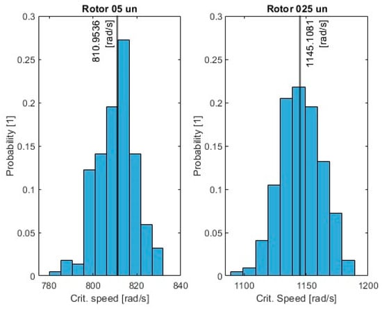 The histograms comparing critical speed distributions for two-rotor configurations (05un and 025un) reveal the impact of unbalanced mass (Figure 10). Rotor 05un configuration, with the mass at the center of the shaft, exhibits a narrower range of critical speeds centered around 811 [rad/s], indicating higher predictability and less sensitivity to mass variations. In contrast, Rotor 025un, with a mass at 0.25 of the shaft length, displays a wider distribution of critical speeds, ranging from 1100 to 1200 [rad/s], suggesting greater variability and a stronger mass dependence. These findings depict the importance of unbalanced mass location in rotor system design. The results suggest that the presence of an unbalanced mass in the relative center of the rotor shaft leads to a more predictable and stable system but with lower critical speed. Although placing it off-center increases operational flexibility, careful consideration of mass distribution is required to mitigate potential resonance risks [28].