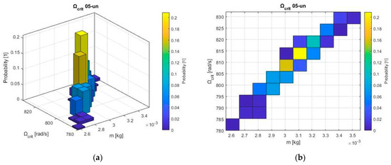 In conclusion, these two sets of diagrams estimate the density probability function for unbalanced mass (m) and critical speed (Ωcrit) as an approximately “linear” function, with mass having a greater impact on the critical speed of rotor 025un configuration.