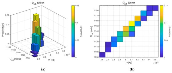 Relation between unbalanced mass and critical speed with the probability distribution for the rotor 025un configuration: (a) Bivariate 3D histogram plot; (b) Bivariate 2D histogram plot.