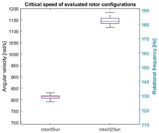 The critical speed for rotor05un is distributed around 810 rad/s (approximately 129 Hz). The interquartile range (IQR), which represents the spread of the middle 50% of the data, is relatively small, indicating that the critical speeds for this configuration are fairly consistent (Table 2).