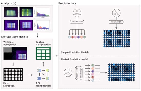 Schematic diagram of the workflow of the detection device and its stages. (a)Preliminary analysis of images acquired under different lighting conditions. (b) A reference image is selected and the area of the well plate on the photograph is identified. A mask is then generated for each image and the image containing each well, i.e., the ROI, is extracted. from this, the numerical features associated with each sample are calculated and stored in tabular form. (c) The obtained dataset was fed into the ML model to classify and regress the concentration categories and actual fluorescence values, respectively. As well as a nested model designed. Reprinted with permission from ref. []. Copyright 2022 Elsevier.