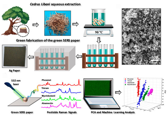 - Sahin, F.; Celik, N.; Camdal, A.; Sakir, M.; Ceylan, A.; Ruzi, M.; Onses, M.S. Machine Learning-Assisted Pesticide Detection on a Flexible Surface-Enhanced Raman Scattering Substrate Prepared by Silver Nanoparticles. ACS Appl. Nano Mater. 2022, 5, 13112–13122. [Google Scholar] [CrossRef]