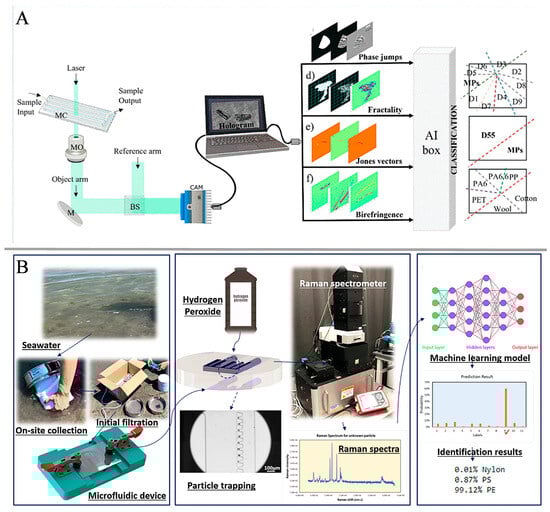 (A) Schematic diagram of DH-AI detection device. Reprinted with permission from ref. []. Copyright 2022 IEEE. (B) Simplified schematic of the process of identifying marine microplastics. Reprinted with permission from ref. []. Copyright 2023 Springer Nature Limited.
