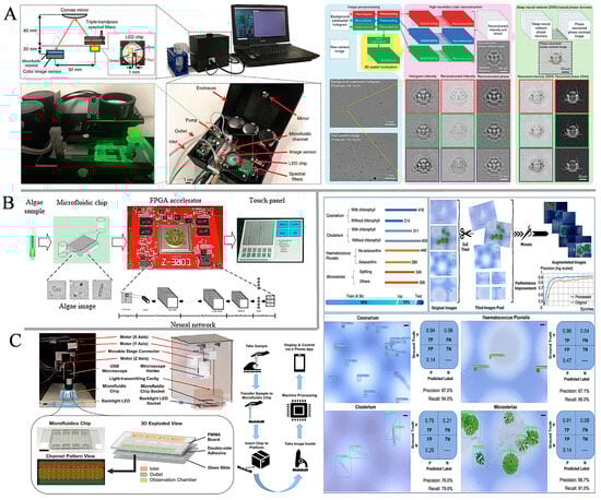 (A) Imaging photographs of flow cytometry devices and algorithms for object segmentation and deep learning-based hologram reconstruction. Reprinted with permission from ref. []. Copyright 2018 Springer Nature Limited. (B) Image of portable microfluidic lensless deep neural network algae monitoring device. Reprinted with permission from ref. []. Copyright 2021 IEEE. (C) Schematic of AIMP and plots of dataset creation and target detection performance for four microalgae. Reprinted with permission from ref. []. Copyright 2024 Royal Society of Chemistry.