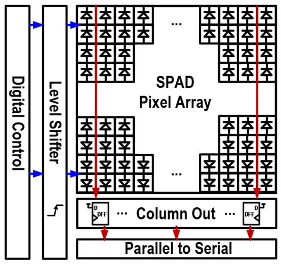 Image sensors play an important role in modern society. Single-photon imaging technology based on single-photon avalanche diodes (SPADs) is an emerging new visual technology. SPAD image sensors have single-photon sensitivity, high dynamic range (HDR), and picosecond time resolution [1,2,3]. Compared to CMOS image sensors, they can achieve various imaging functions such as HDR two-dimensional (2D) imaging [4,5,6], three-dimensional (3D) imaging [7,8,9,10], and fluorescence lifetime imaging (FLIM) [11,12,13]. Kumagai et al. designed a 3D SPAD sensor capable of measuring distances up to 150–200 m, with an accuracy of 0.15–0.3 m and a 3D imaging frame rate of 20 fps [7]. Ulku et al. designed a SPAD sensor known as “SwissSPAD2”, which has a resolution of 512 × 512, a fill factor of 10.5%, and a minimum gating time of 5.75 ns [12]. SPAD sensors can be applied in multiple fields including security surveillance, autonomous driving, and biomedicine. Their broad application prospects have prompted many companies and research institutions to conduct studies on this technology [14,15].