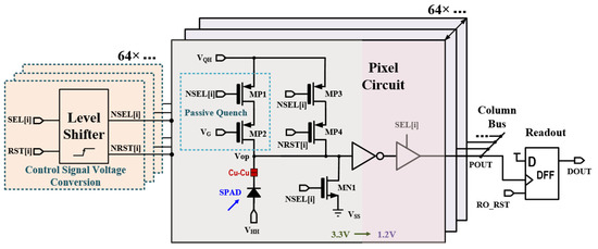 Figure 1 shows the architecture of the 3D stacking chip. The 64 (rows) × 128 (columns) SPAD array was implemented in the upper chip fabricated in a 180 nm process, while the pixel circuit array and other modules were implemented in the lower chip fabricated in a 130 nm process. The top-layer SPAD device array and the bottom-layer pixel circuit array are interconnected at the pixel level in the vertical direction through Cu-Cu hybrid bonding [27,28]. The I/O signals of the bottom-layer chip are also routed out from the top-layer chip through a combination of hybrid bonding and through silicon via (TSV).