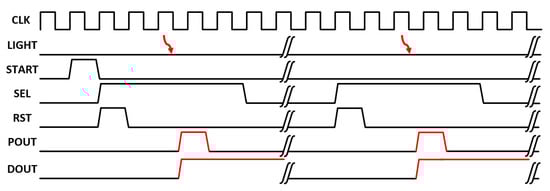 The timing diagram of the pixel circuitry and readout circuitry is shown in Figure 4. After the START signal initiates the chip, pixels are selected and reset by SEL and RST. If a light signal triggers avalanche in the SPAD, a falling-edge signal will be generated at VOP. This signal is then inverted by an inverter to generate a rising-edge pulse signal of 1.2 V. Subsequently, it passes through a three-state gate and is then output to the column bus POUT. The readout circuit employs a D flip-flop to sample and hold the electrical pulse signal output from the bus. The designed pixel circuit uses a minimal number of MOS transistors to achieve SPAD gating and quenching functions while enhancing the SPAD’s photon detection capability. This design lays a solid foundation for the sensor to achieve low-light imaging.