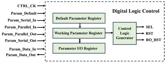 The structure of this module is shown in Figure 5. It includes three parameter registers: a default parameter register, a working parameter register, and a parameter input/output (I/O) register, as well as a control signal generator. The bit width of the three registers is 448 bits. The function of the default parameter register is to store a set of typical parameters, allowing the chip to operate normally without external input. The function of the working parameter register is to store the parameters used during the chip’s operation. The control signal generator will generate the control signals based on the working parameter register. The parameter I/O register serves as the interface between the module and the parameter data outside the chip.