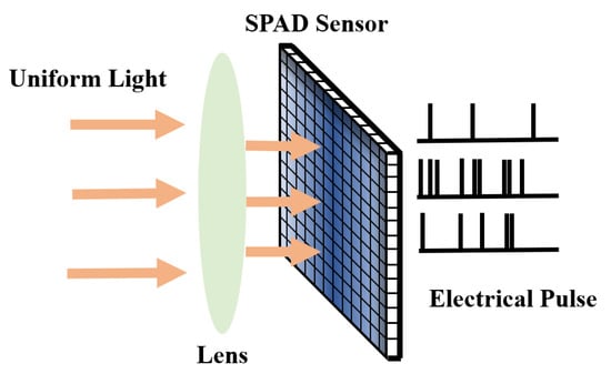 The principle of 2D imaging for SPAD sensors is to convert incident light into discrete electrical pulses, where the pulse density reflects the intensity of the light. Due to the nonideality of the manufacturing process of SPAD devices, different SPADs in the pixel array have varying PDP and DCR values. This results in different electrical pulse sequences even under completely uniform illumination conditions, as shown in Figure 7. In SPAD sensors, the pixel array directly outputs digital pulse signals, eliminating the need for further AD conversion. Therefore, the non-uniformity of the pixel array’s PDP and DCR contribute significant noise in SPAD image sensors.
