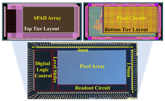 Since the chip utilizes a 3D stacking architecture, an elaborate layout plan and de-sign are necessary for the multi-layer chip. The upper plane of Figure 8 depicts the layout and microscope of the SPAD sensor chip including the upper SPAD array chip and the lower circuit chip. The overall sizes of the upper and lower chip layouts remain completely identical, and the positions of the I/O pads also match strictly. Due to pixel-level signal connections, the unit sizes and positions of the pixel circuit array on the lower chip and the SPAD array on the upper chip should be completely identical, with each pixel corresponding to its counterpart. The individual size of the SPAD in this chip is 21 μm × 21 μm, as is the individual pixel circuit dimension. Within the constrained layout space, it is necessary to arrange the various components of the pixel circuit reasonably, considering both the convenience of overall wiring connections for the pixel array and the power supply capability.