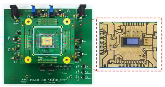 The final chip photograph, after fabrication, is shown in the lower half of Figure 8. The overall size is 1.9 mm × 4 mm, with a 64 (rows) × 128 (columns) pixel array. The positions of the circuit modules such as the pixel array, digital control circuit, level shifter, and readout circuit are depicted in the chip photo. The chip features a layer of microlenses on the surface, which further enhance the pixel fill factor and improve the sensor’s low-light detection performance [38,39,40].