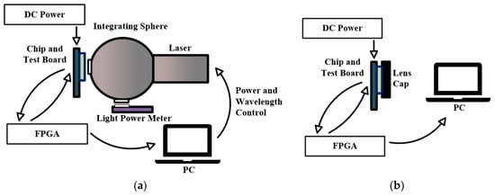The pixel characteristics (PDP and DCR) testing system is shown in Figure 10. The PDP testing system consists of a DC power, chip and test board, light source and integrating sphere, light power meter, FPGA board, and a host computer, as shown in Figure 10a. The DC power provides power to the chip and test board. The light source and integrating sphere provide a uniform illumination condition. Additionally, we developed a dedicated FPGA testing project, which can configure the chip, receive output data, and transmit to the host computer.