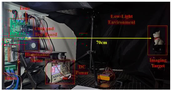 The specific built low-light imaging test system is shown in Figure 11. We equipped the chip with a suitable lens (F-number: 1.4) and placed the entire system in a darkroom. An adjustable light emitting diode (LED) light source was included to regulate the ambient light intensity, and a high-precision illuminance meter (Jinan FLS Optoelectronics Technology Co. Ltd., Jinan, China) was used to calibrate the ambient light intensity. The imaging target is a small dog figurine, positioned approximately 70 cm from the sensor. The chip’s low-light imaging results will be presented later.