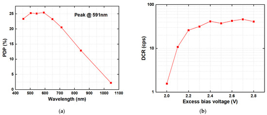 Measurement results of pixel characteristics: (a) PDP versus light wavelength at 2.4 V excess bias voltage; (b) DCR versus excess bias voltage at room temperature.