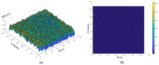 Figure 14 shows the PDP and DCR map used in the above denoising algorithm. In Figure 14a, the PDP map of the chip pixel array at a wavelength of 591 nm is displayed, which reflects the uneven sensitivity of the chip. The average PDP of the pixel array is 25.4%, with a standard deviation of 1.4%. Figure 14b shows the DCR map of the pixel array at room temperature with an excess bias voltage of 2.4 V. The bright spots represent pixels with higher dark count levels. Figure 15 quantitatively shows the data distribution of the DCR map. In the entire pixel array, the number of pixels with a DCR less than 100 accounts for 97.1%, the number of pixels with a DCR between 100 and 1000 accounts for 2.3%, and the number of pixels with a DCR greater than 1000 accounts for 0.6%. The unevenness of both PDP and DCR can affect the final imaging results.
