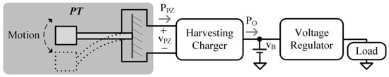 PTs convert mechanical energy, in the form of motion or vibration, to electrical energy that can be harvested to charge a battery, , and power a microsystem, as illustrated in Figure 1. Ultimately, maximizing the harvester’s output power, , is most important, but to do so, an understanding of how the PT delivers power, , is required [6,7,8].