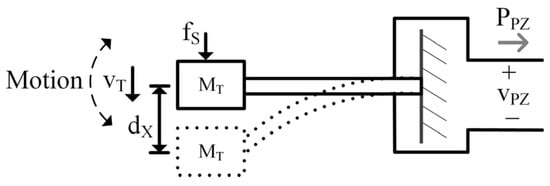 In Figure 2, the PT mass, , has kinetic energy when in motion with velocity, . Similarly, a capacitor has energy when a voltage develops across it. So, can be modeled as a capacitor, where , and the mass’s velocity, in , is analogous to the capacitor voltage, [22,23]: