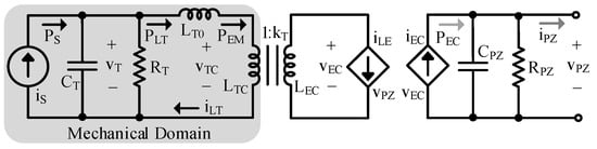 The energy transfer between the mechanical domain (MD) and electrical domain (ED) of a PT is typically modeled with a transformer [9,10,11]. Since PTs and piezoelectric (PZ) materials are not capable of capturing all mechanical energy present for conversion to the ED, a coupling coefficient, , exists: