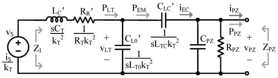 In a PT, it is generally accepted that velocity begets current, , so the two dependent current sources are used in conjunction with the transformer to couple to [1,4,7,9,16,17,18,19,20]. The dependent current sources perform a voltage-to-current conversion which reciprocates impedances (i.e., resistance to conductance, inductance to capacitance, etc.) and dividers (i.e., voltage dividers to current dividers and vice versa). Lastly, models the PT’s ability to store electrical energy, and models leakage. is often dominated by the capacitance that exists between the PT’s electrodes [10,27]. The parameters in Figure 3 are the most fundamental to the model, so they have been italicized in the text to assist the reader in tracking them throughout the paper.