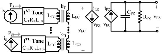 Each tone adds resonance in the same way as the fundamental, so adding LCR loops coupled to the ED via transformers accounts for them, as shown in Figure 7. Note that the current/force source in the additional tones is equal to the fundamental’s source, and that the mechanical parameters, , and are likely different for each tone [10].