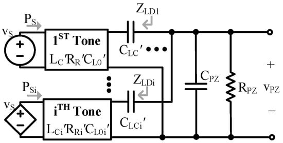 If operating the PT with a constant applied force of frequency , no energy is supplied by the higher tones, so they simply act as capacitive loads. In this case, use , shown in Figure 14, in (39). This way, will include the capacitive effects contributed by the higher tones, providing the correct loading with respect to the MD but overestimating the ED’s energy storage capacity.